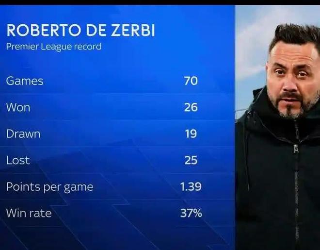 德泽尔比此前执教布莱顿在英超出战70场胜率仅37%,场均1.39分